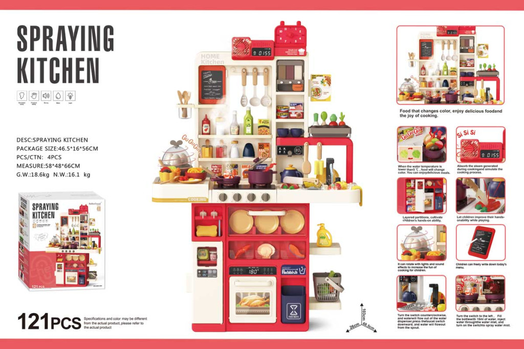 Această bucătărie impresionantă cu 121 de piese nu este doar o jucărie, ci un adevărat centru de experiență. Datorită funcțiilor moderne, copiii se pot simți ca într-o bucătărie reală: pot spăla vase cu apă adevărată, pot găti în oale „cu aburi” și pot observa cum alimentele își schimbă culoarea.