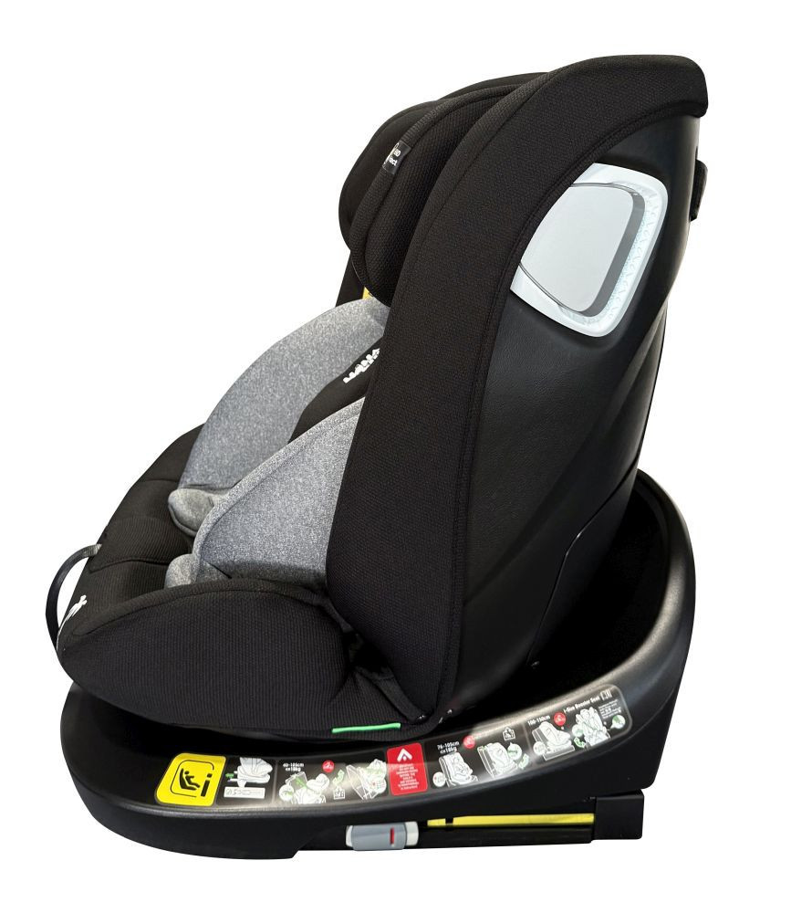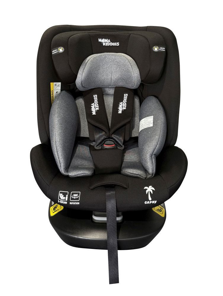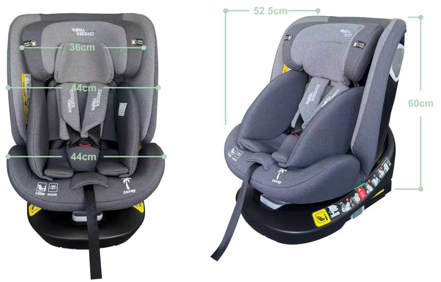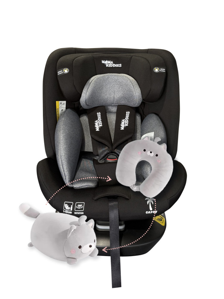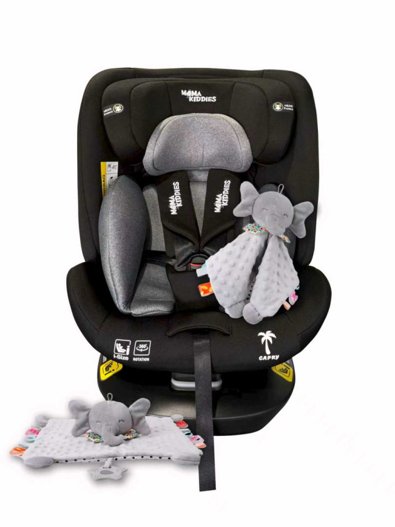 Asigură o călătorie sigură și confortabilă. Scaunul auto se poate roti la 360°, are spătar și tetieră reglabile. Mama Kiddies este dedicată siguranței și confortului copiilor, stabilind cu acest model un nou standard în domeniul siguranței auto pentru copii.