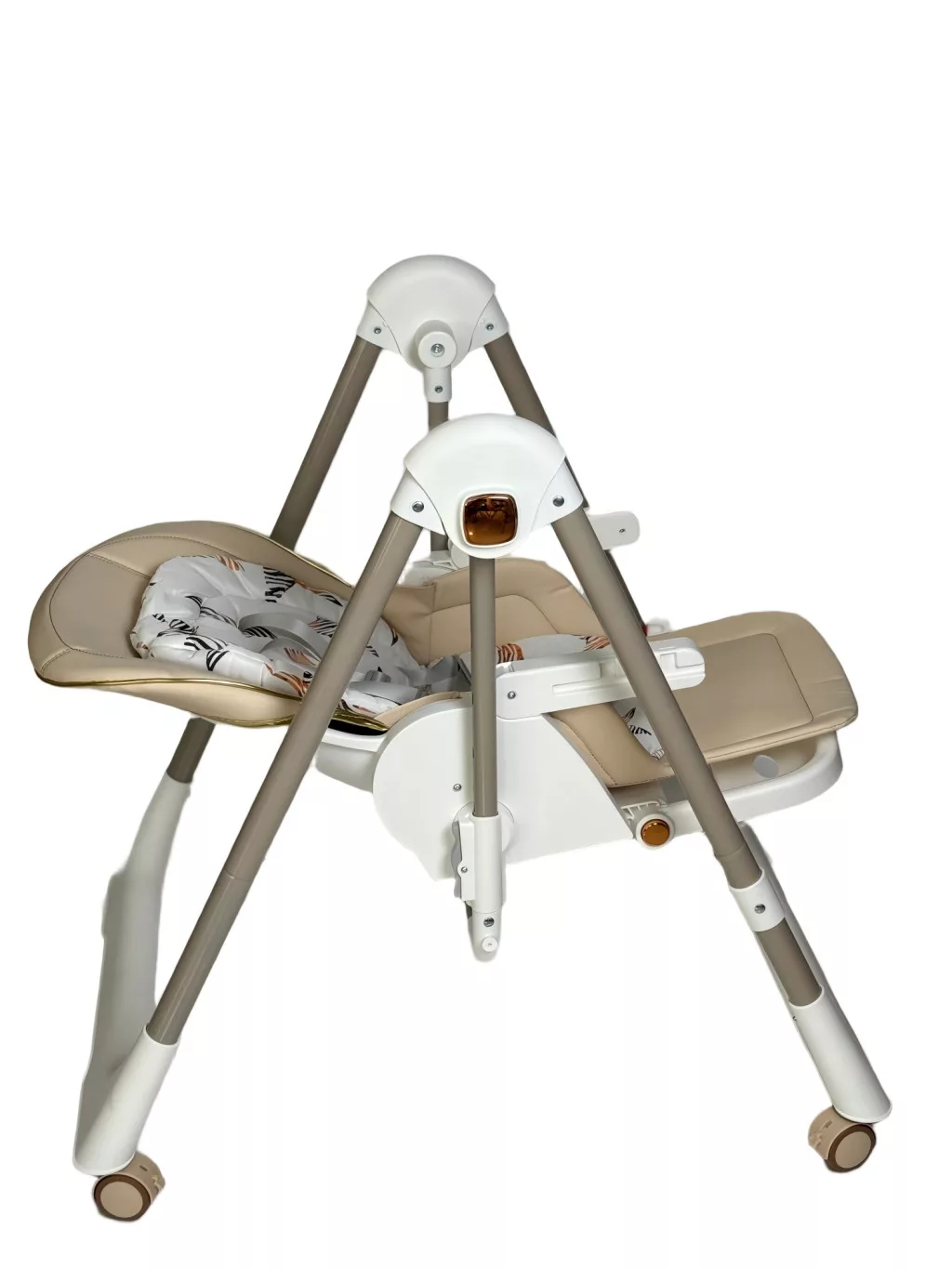 Cadrul solid oferă stabilitate, iar cele patru picioare sunt echipate cu roți din cauciuc care pot fi blocate. Roțile permit deplasarea liberă a scaunului fără a deteriora podeaua. În plus, se transformă ușor într-un leagăn care oferă copilului confort maxim.