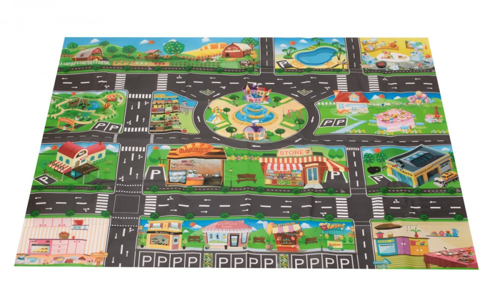 Covoraș de joacă mare, impermeabil, cu model de oraș și accesorii, din plastic asemănător pânzei uleioase, foarte subțire și ușor. Setul include, printre altele, 18 diferite indicatoare rutiere și 18 autocolante.