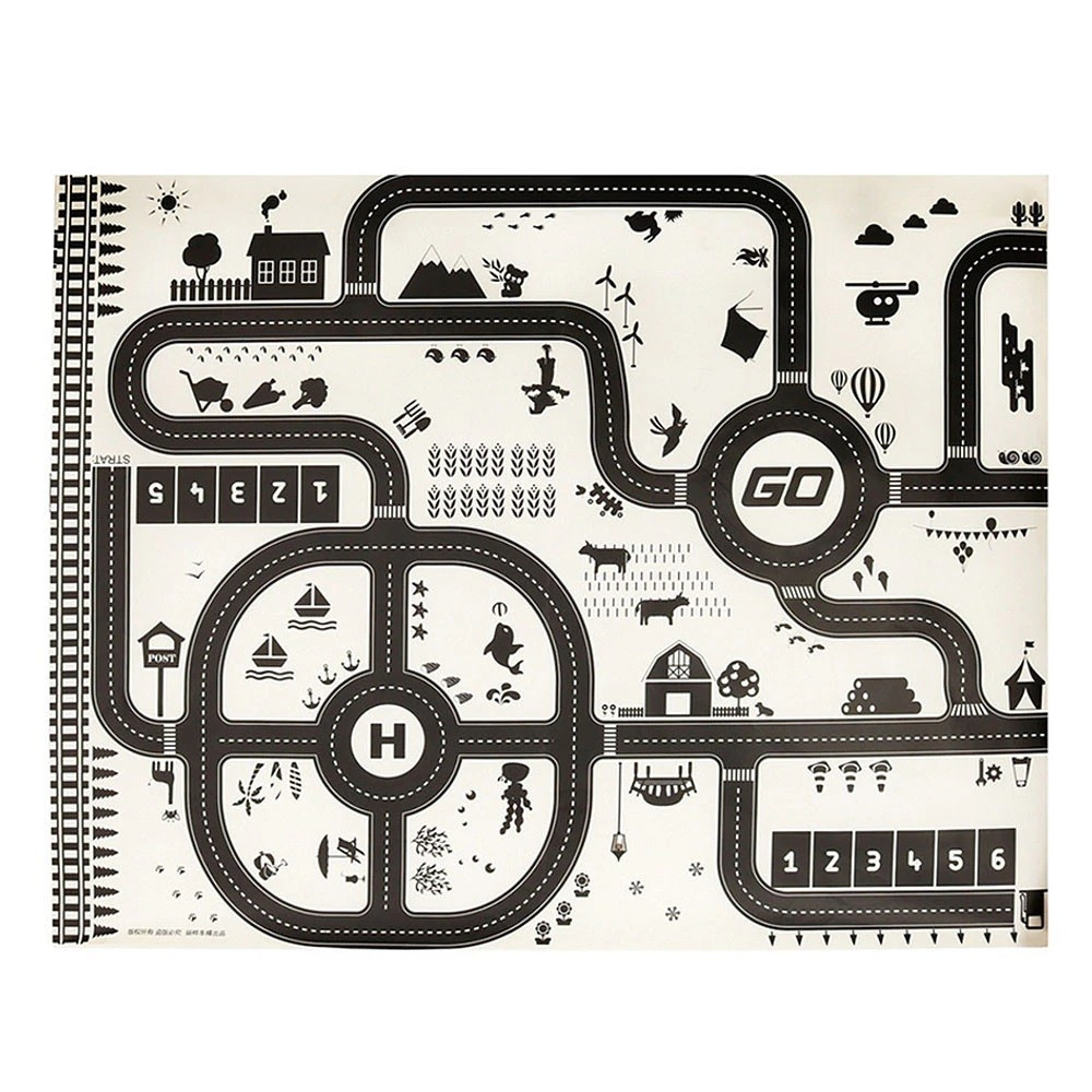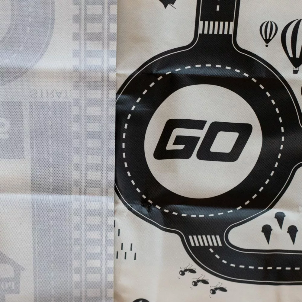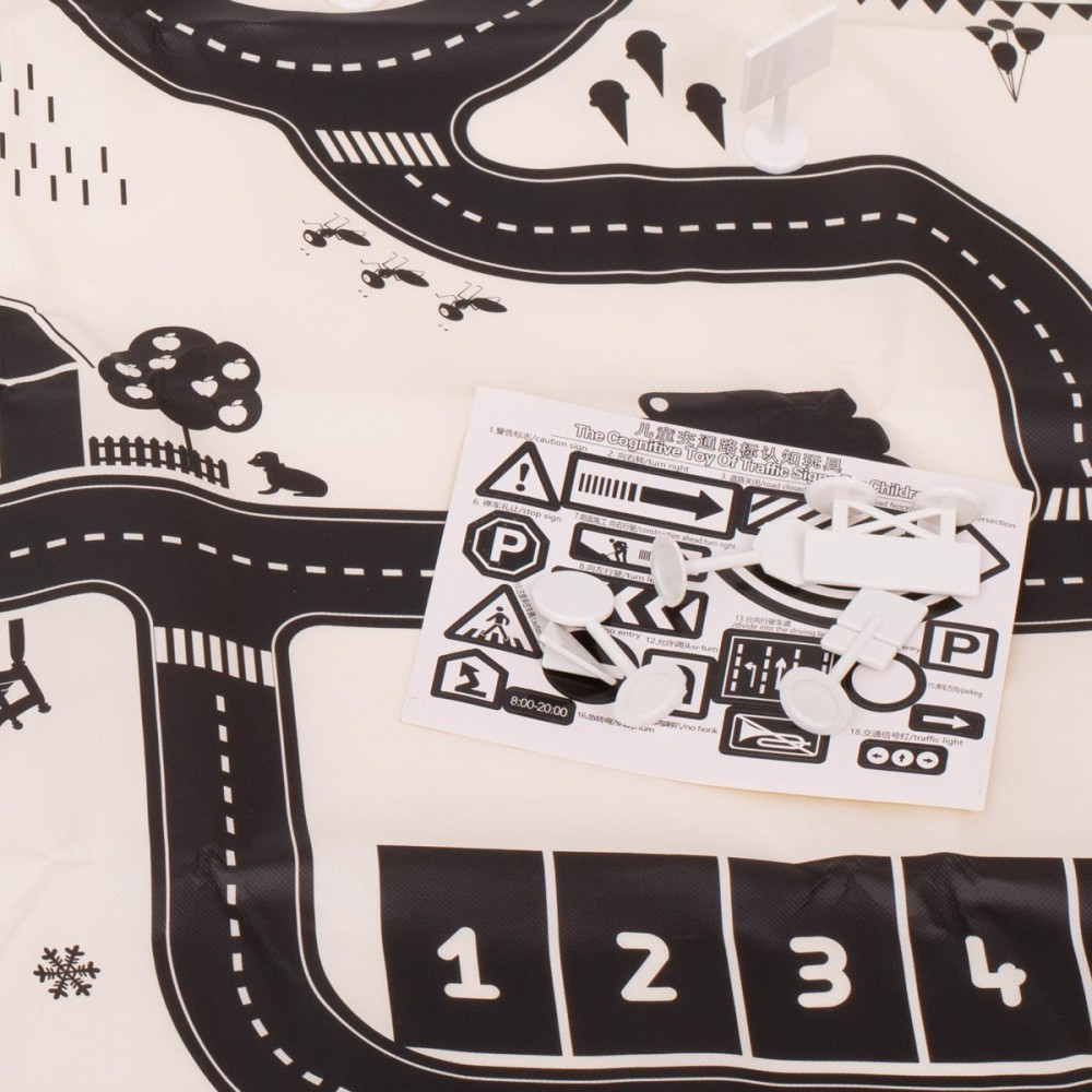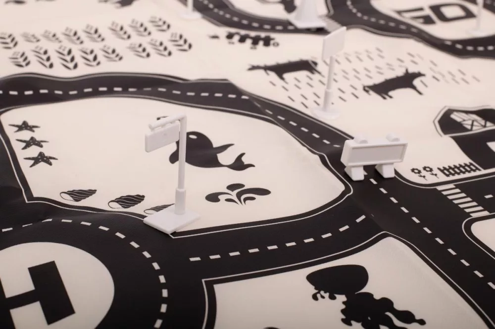 Covor de joacă subțire, impermeabil, cu model urban. Util pentru învățarea regulilor de circulație. Fabricat din plastic asemănător cu mușama. Setul conține un covor de joacă, indicatoare rutiere și autocolante.
