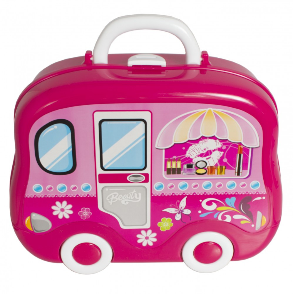 Set cosmetic împachetat într-o cutie în formă de autobuz, cadou perfect pentru fetițe. Material plastic.