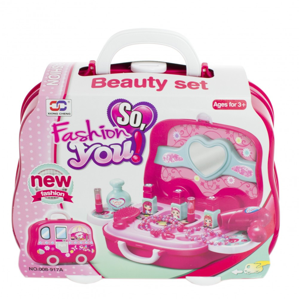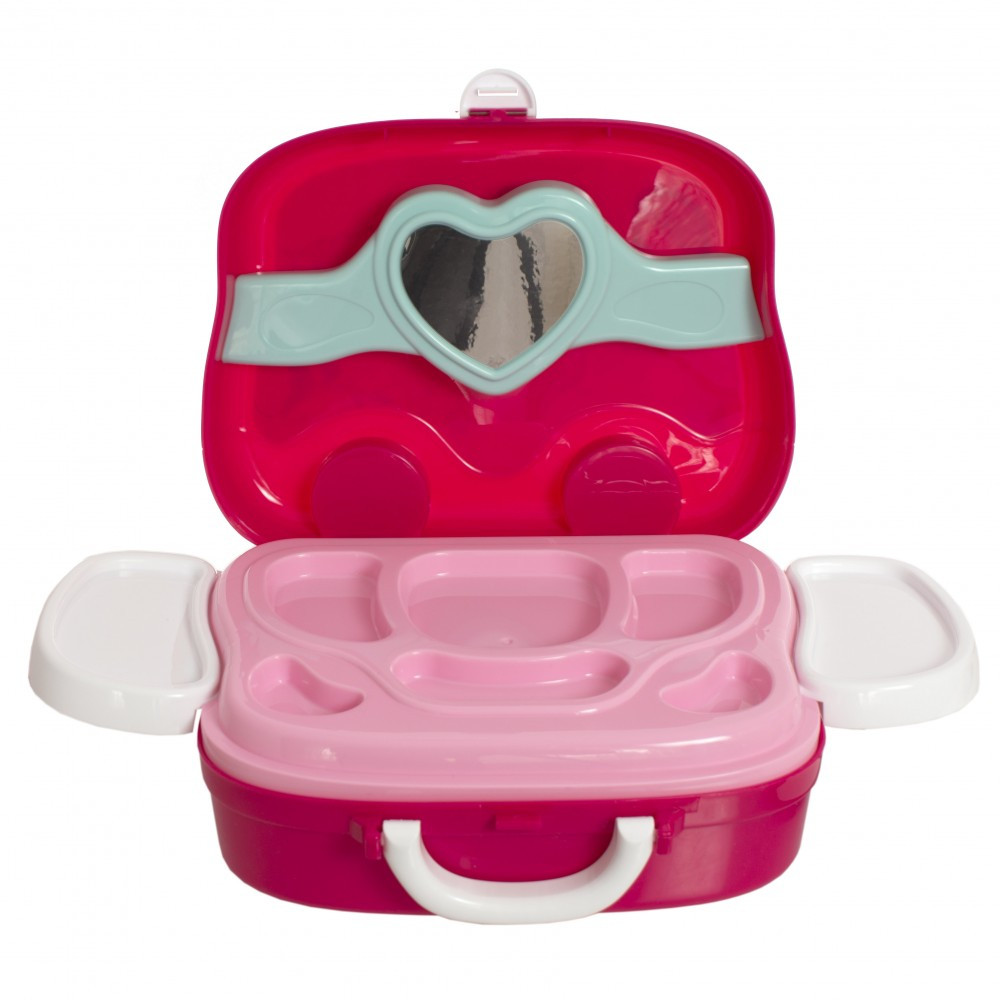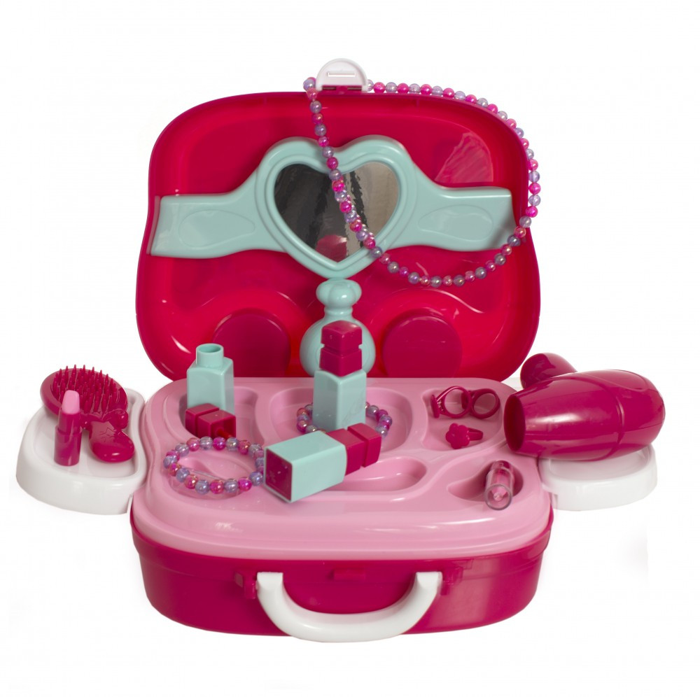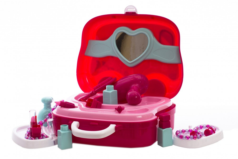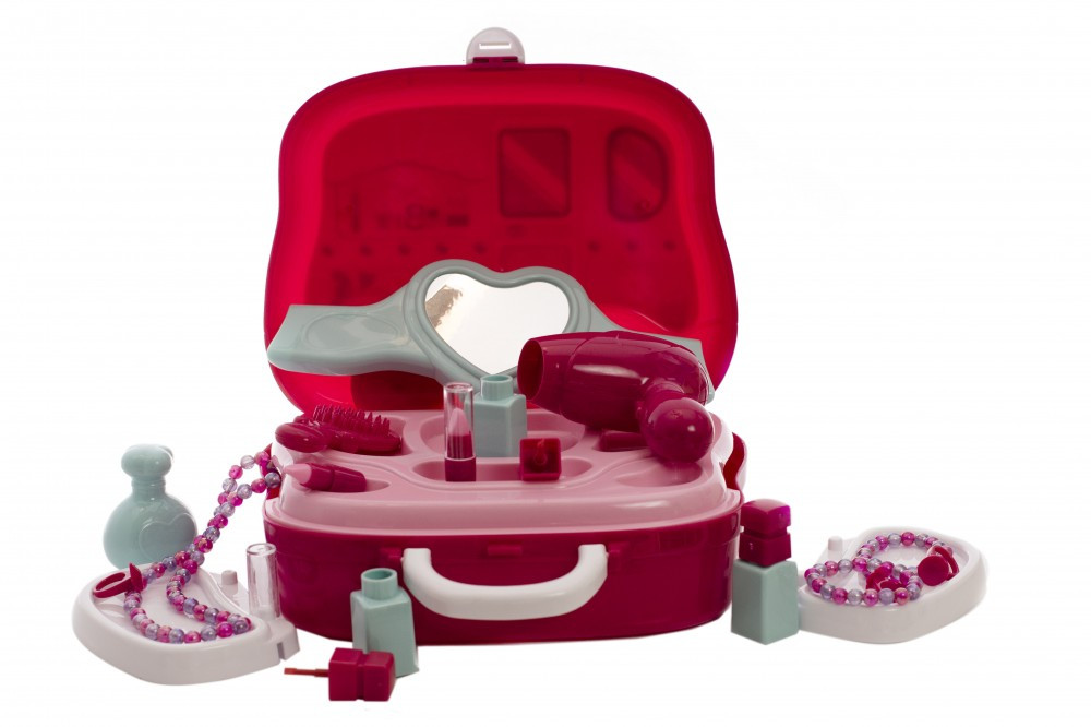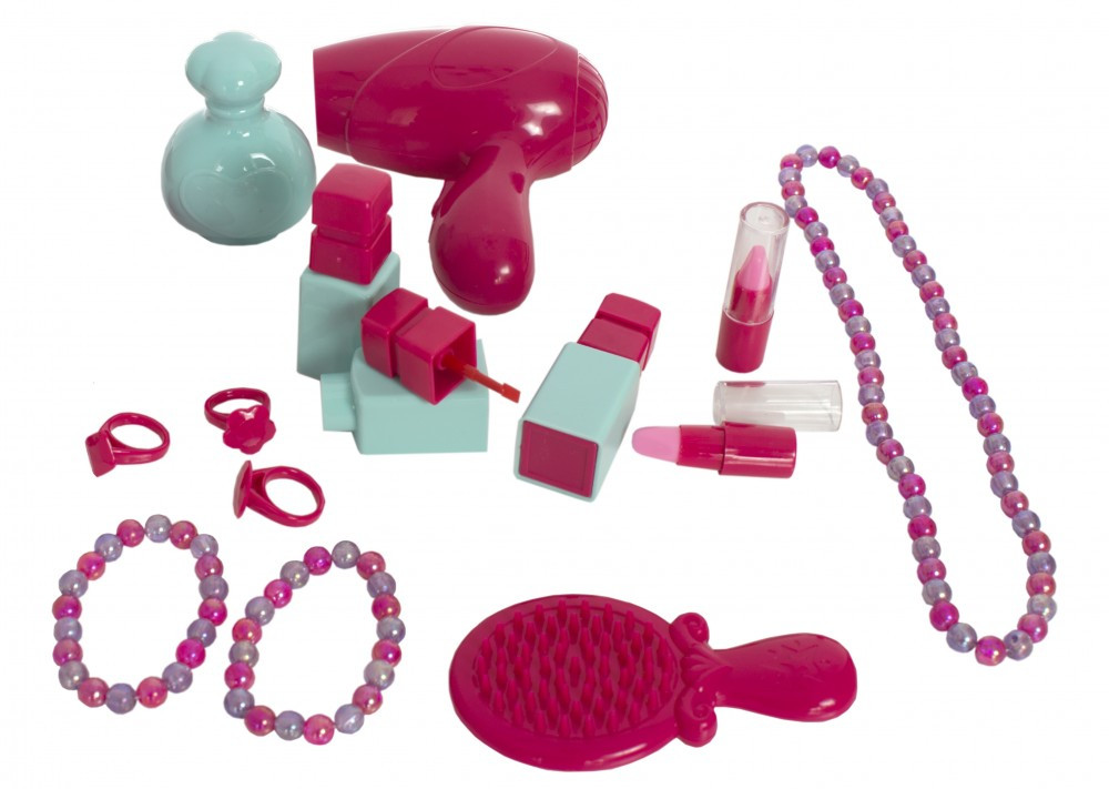 Setul conține: valiză, adezivi, 2 buc brățele, 3 buc inele, 1 buc lanț, 3 buc lacuri de unghii, 2 buc luciu de buze plastic, uscător de păr, oglindă, pieptăn, sticlă parfum plastic.